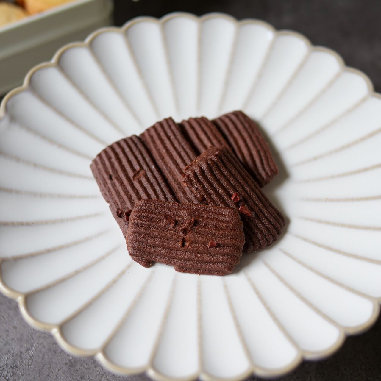 →軽い口溶けのココアクッキーに有機カカオニブをトッピングしました