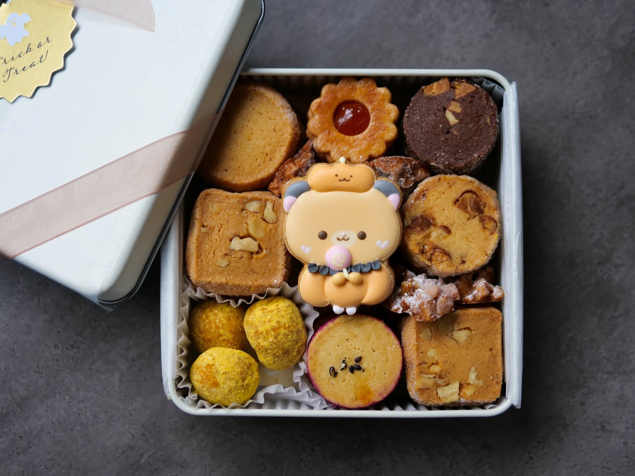 ハロウィンモチーフのアイシングクッキーを入れた秋らしいクッキー缶をご用意いたしました。