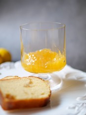 果皮だけでなく果汁も加えた生地を焼き上げ、瑞々しい柚子のグラスでコーティングしました。